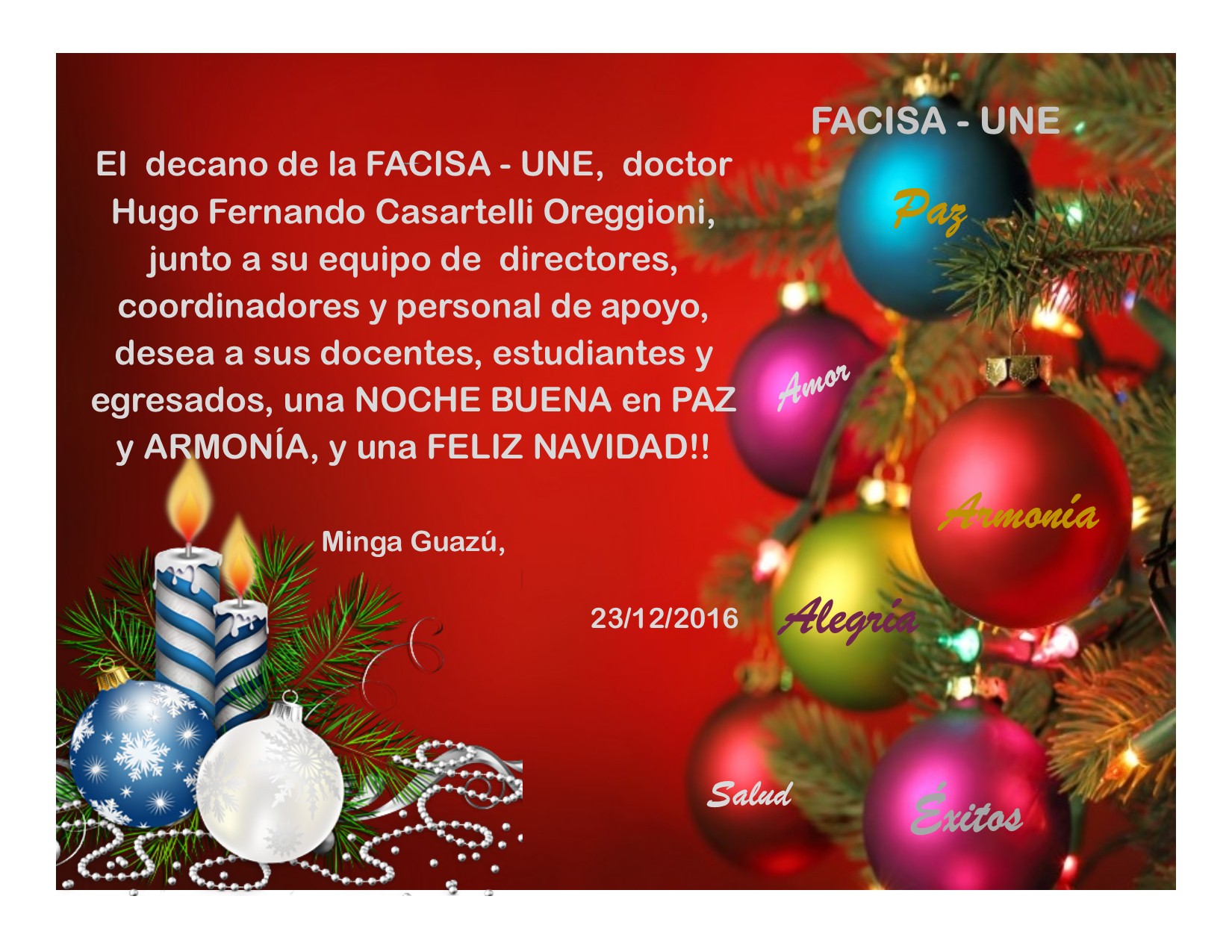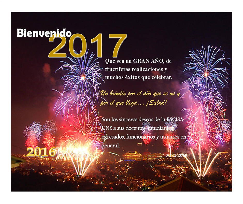 Esta Unidad Académica, SALUDA, por las festividades de fin e inicio de año, a sus docentes, estudiantes y egresados de las carreras de grado y programas de posgrado, funcionarios, a los integrantes de la Comunidad “Norma Luisa” del Km 13 ½ Minga Guazú, asiento del área de demostración DEMOMINGA, a los usuarios del Programa COMUNE y SYMIMI y, a todos los que de una u otra manera, son parte importante de los emprendimientos institucionales, y les augura un 2019 de fructíferas realizaciones y muchos éxitos.